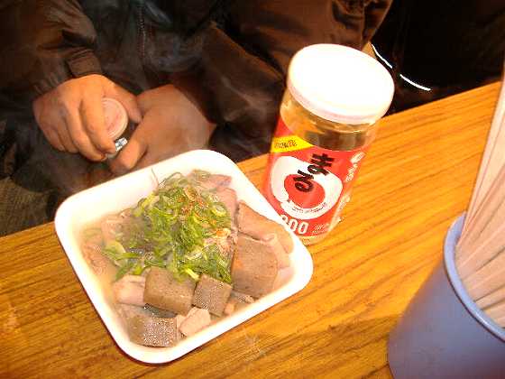 熱燗でも良かったし、たこ焼きも美味しそうでした。 おでん(¥500)も魅力的だったのですが、 おでんだと熱燗かビールが無ければ辛い・・・。 その後にはレストランバータイムもあるし、 つまりは、この時、OYAJIの「悩み」の最大の原因は懐具合だったのです(爆) 生ハム???http://oyaji3.com/b/namaham.jpg屋台ゾーンの、とある露天商の軒先に展示していたものです。