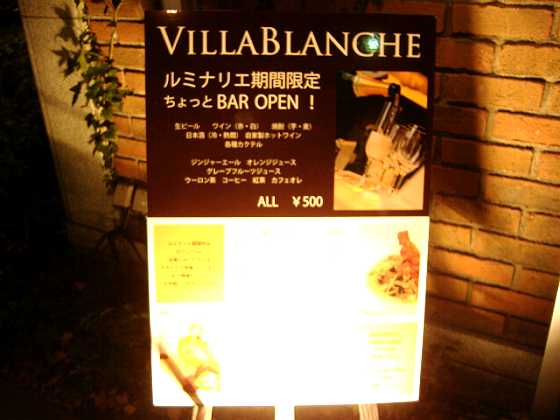 神戸ルミナリエ 2008 ルミナリエ 神戸 イルミネーション イベント 鎮魂 オフ会 off ◆ 関連記事 ◆(記〜事は続く〜よ〜♪ど〜こま〜で〜も〜♪(爆)) ■ 準備万端♪行って来ます! (予告記事) ■ ☆★ルミナリエに行こう2008★☆オフ会(1) ■ 阪神淡路大震災・慰霊と復興のモニュメント(2) ■ 神戸ルミナリエ 2008 夕刻編 (3) ■ 神戸ルミナリエ 2008 写真編 (4) ■ 神戸ルミナリエ 2008 写真編 (5) ■ 神戸ルミナリエ 2008 群集編 (6) ■ 神戸ルミナリエ 2008 屋台ゾーン編・他 (7) 神戸ルミナリエバナーの利用についてはこちらのページを参照して下さい。 ★そろそろ「もう飽きてきたぞ〜!!」と お叱りを受けるかもしれませんが ルミナリエシリーズはまだ続きます(笑) 幹事さんが19時に予約して戴いたレストラン ヴィラブランシュ で オフ会参加者の皆さんが一堂に会しました。 東遊園地内にある素敵なレストランです。 ルミナリエ期間中は、「ちょっとBAR」OPEN!という事で ドリンク類が500円均一料金で営業しているようです。 ともかく、寒かったのでやっと屋内に入れる〜!と思っていたのですが なんと通されたのは寒風吹きすさぶ屋外のテラス席(つД`) (笑) ま、こればかりお店側の都合なのでしょうがないですけどちょっとショック;; 珍しかったのは、 屋外テラス席用の頭上ストーブ が各テーブルに設置してあった事。 こういうストーブがあるんですね!初めて見ました。 最長部は2mぐらいの位置にあるんですが 顔のあたりが、ほんわか火照るぐらいに思ったより暖かかったです♪ ドリンク注文時に、何を飲もうかな〜?と思っていると 隣に居たちゃぴさんが ホットワイン なるものを注文していたので 「ん? 何それ?」と思い、メニューを見ると 自家製ホットワイン というものがありましたので 私もそれにしちゃいました。ホットのワインって、初めての体験です!! 湯気が立って、熱々の赤ワインは少し甘めでしたが すっごく温まってめっちゃ美味しかったです〜! これは冬の寒い日にはいいですね〜!! 普通に家でワインを温めても出来るのかなぁ? こちらは、ちゃぴさん達が頼んだオードブル盛り合わせですが 少し戴きました♪ ご馳走様です。 すっごく美味しくて、またこのレストランにランチに来なきゃ!って思っちゃいました(笑) ここで1時間ほど、皆さんと歓談して20時ごろに帰りました。 帰りに、屋台通りで見て気になっていた 「神戸ワイン ルミナリエセット(ハーフワイン2本1000円)」 を買って帰りました。 次でようやくこのシリーズの完結です♪(笑) ■このシリーズに掲載している画像は元画像のわずか 約10% 程にまで縮小(ダイエット)しています。