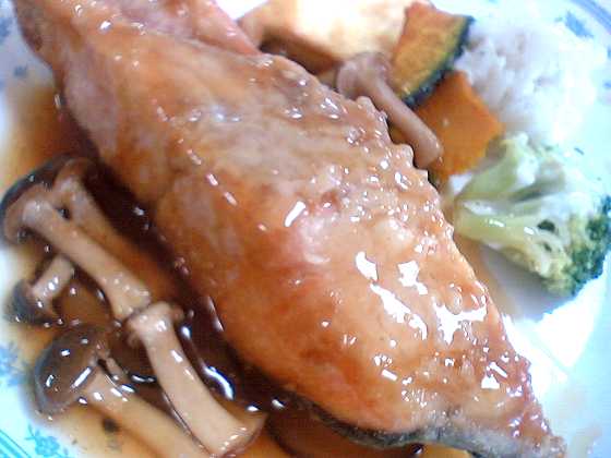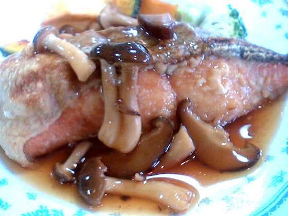 たまには肉ばかりじゃなくて、魚も食べないと・・・ との『焦燥感』からこちらを選びました(笑) で、ふと思ったのですが 秋茄子は嫁に食わすな(語源由来事典) という諺(ことわざ)が思い浮かんだのですが この デップリと太った秋鮭も 嫁に食わしてしまうと、 『ますます奥さんがデップリと太って困ってしまう亭主っていうのも 世の中には少なからず存在するのではなかろうか?』 との疑問が、昼食中の私の頭の中によぎりました・・・・。 下にその写真を掲載してますが、 この鮭、本当にぶ厚くカットしてあって丸々としています。 いえいえ、決して世の奥様の全てが デップリとしていると言っているわけではありませんが、 なんとなく一般的なイメージとして、 そういう嫁ハンを想像してしまうのは悪い癖でしょうか? 秋鮭と言うからには、茄子同様に「時期もの」で 秋には脂が乗ってて美味しいのだろうなぁ? と、ろくに旬も覚えてはいないのだけれども ネーミングだけで、勝手にそう思っているのですが、 だとすると、この脂の乗った鮭を嫁に食わしてしまうと、 ますます・・・・ なんて事を考えながら、美味しく戴きました♪(爆) キノコソースって・・・http://oyaji3.com/b/ajoks01.jpgこの「きのこソース」をわざわざカタカナに表記している点に