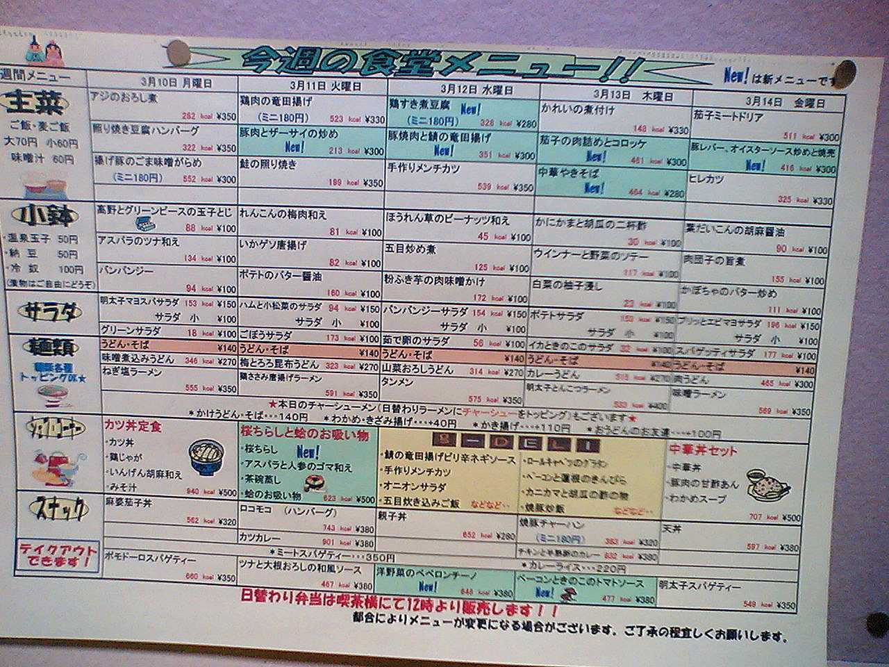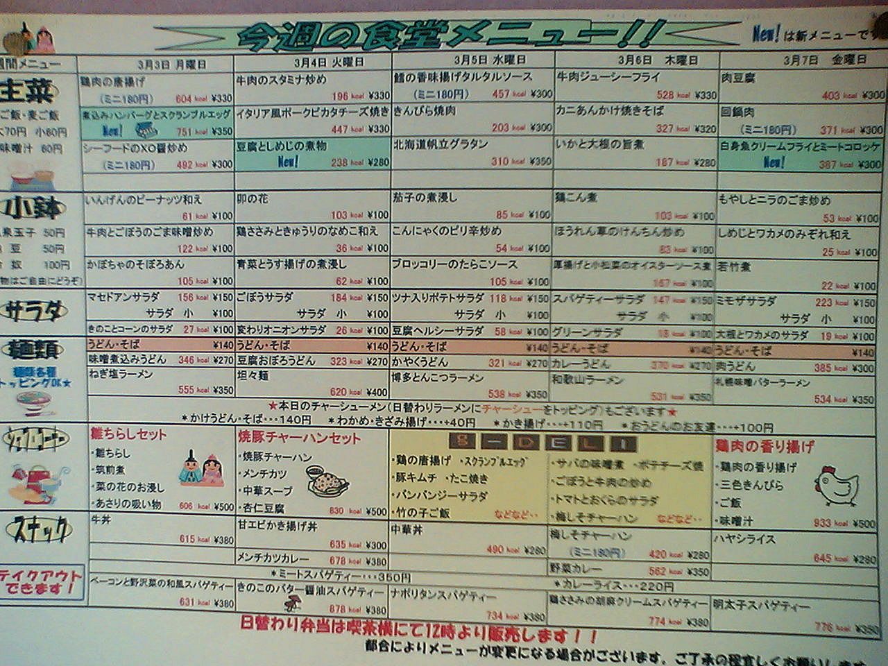 最近あんまり見なくなったなぁ・・・。 値上げもしたし、材料費高騰しているのかもしれませんが 哀しい現象です・・・。 ★この週のメニュー表です♪http://oyaji3.com/b/menu0303.jpgこの週のメニュー表です。(遅番シフト) (クリックで拡大します) ※そうとうに記事更新が遅れていますので、 もはや、思い出すための「脳のリハビリ運動」になってます。 ★ ヤフーで使えるブログパーツのご紹介! → ヤフーブログガイド ■ ◎今日のランチ◎・記事一覧リストはコチラ♪(Yahooブログ検索リスト)