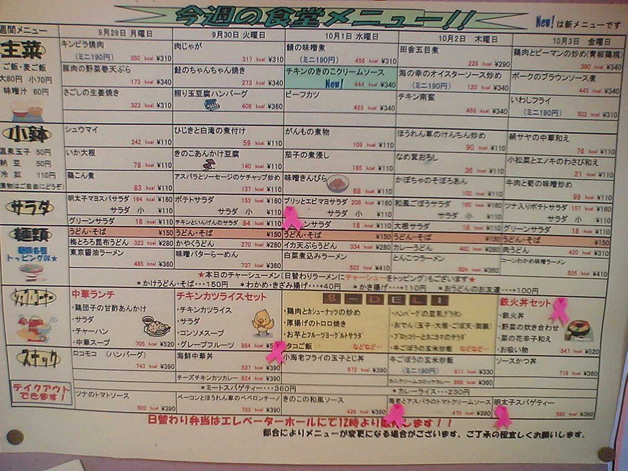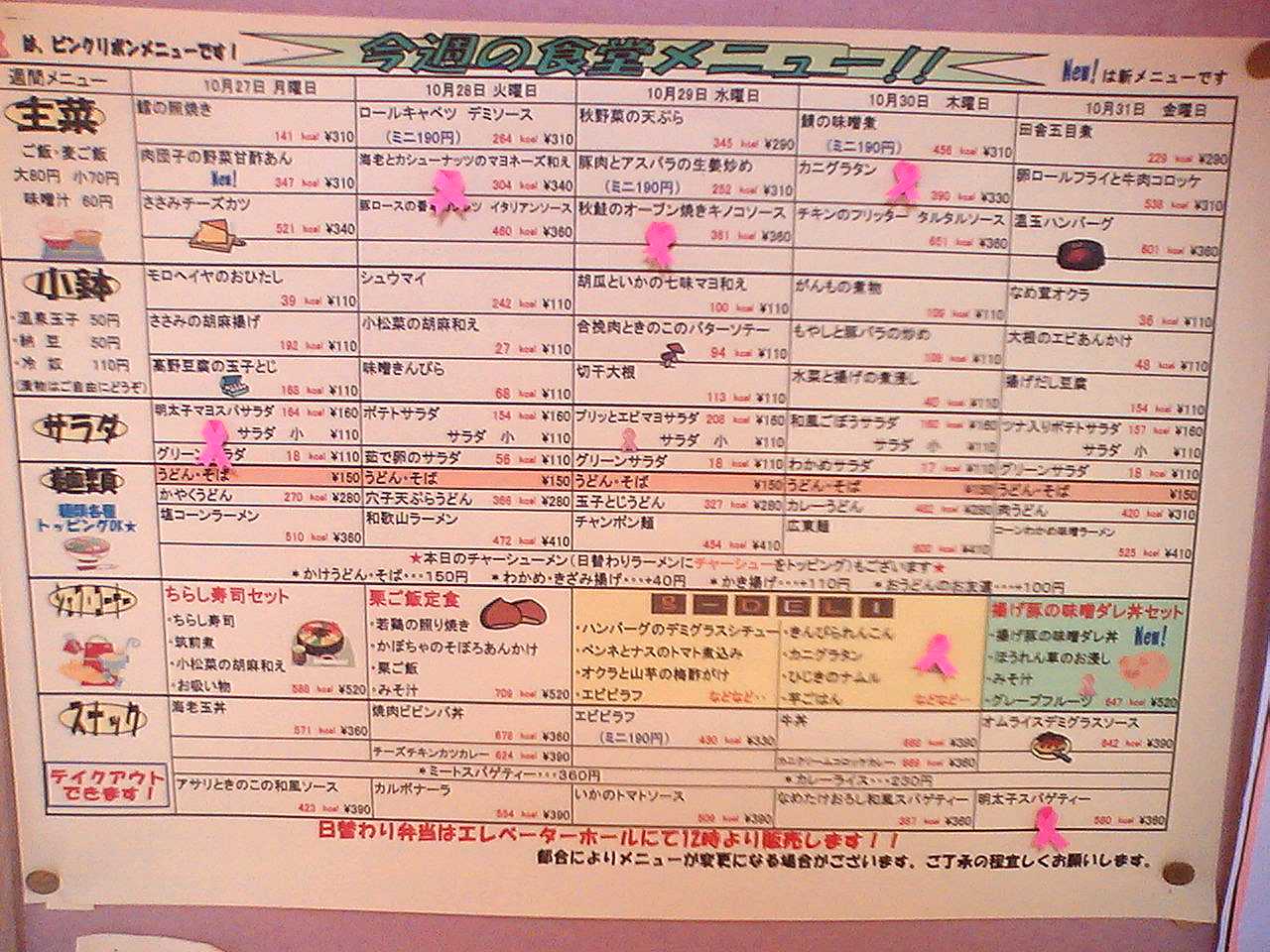 ピンクリボンメニュー SP001 社員食堂シリーズ 社員食堂 シリーズ ランチ お昼ごはん ◎S ★ このブログをあなたの MY Yahoo! に追加♪ ピンクリボンメニュー★ 社員食堂シリーズ ★ スペシャル編★8月に、2月に食べた分の記事を投稿して以来、 一向に、遅々として記事投稿がますます追いついていない この社員食堂シリーズなのですが(汗; Yahoo!でもブログやYahooアバターなどで ピンクリボンキャンペーンを開催中なのですが、 なんと、うちの社員食堂でも「ピンクリボンキャンペーン」が 大々的に開催されています(笑) もうビックリです(爆) なんでも、癌予防に効果があるようなメニューを ピンクリボンメニューとして提供する・・・というコンセプトらしく メニュー表にちゃんとピンクリボンを付けているという 芸の細かさです(笑) しかも、あちこちにピンクリボンキャンペーンのポスターが 貼り付けられていて、普段の雰囲気とは明らかに違います;; うちの社員食堂も、なかなかやりますね〜!! そこまでするか?(苦笑)http://oyaji3.com/b/menu20080929.jpgこの週間メニュー表を見て、思わず苦笑しちゃいました。 ピンクリボンメニューの1つ1つに 小さなピンクリボンをわざわざ作って貼り付けているんです♪ (メニュー写真はクリックすると拡大します) ▼ちなみに、社員食堂シリーズ記事ネタは、 もちろん、まだ毎回食べるたびに撮影し続けていますので およそ半年分のブログネタが溜まりに溜まっています(爆) はい、頑張ります(汗; ★ ヤフーで使えるブログパーツのご紹介! → ヤフーブログガイド ■ ◎今日のランチ◎・記事一覧リストはコチラ♪(Yahooブログ検索リスト)