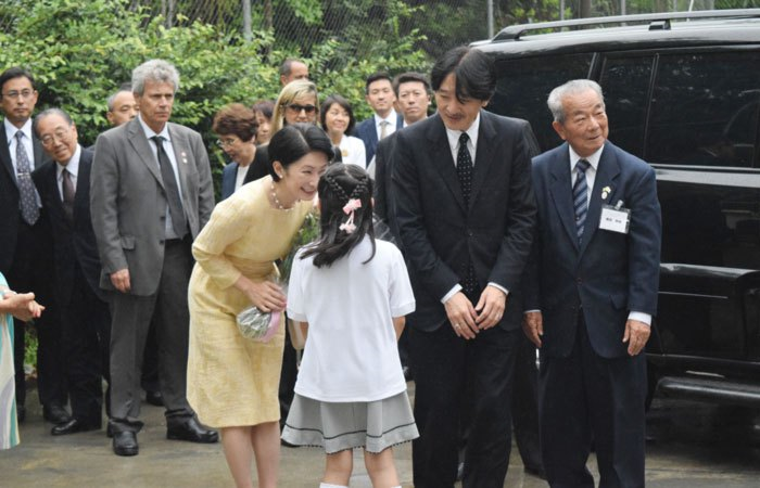 【羽田和正記者】ご来伯11日目となる7日、秋篠宮ご夫妻は同日午後3時45分から午後5時42分まで「リオ日系社会・在留邦人行事」にご臨席された。殿下は黒の靴とスーツに、四角ドット柄のネクタイをご着用。紀子さまは、乳白色のパンプス・ヒール、黄蘗(きはだ)色の葉脈柄ワンピース、エンベロープバッグを手に、真珠のブレスレット、イヤリング、ネックレスを着用された。