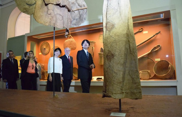 ご夫妻は博物館入口で降車後、クラウジア館長など同館関係者らから出迎えられた。クラウジア館長案内により、ご夫妻は古生物学(恐竜化石)展示、動物学(海洋生物)展示、ブラジル考古学(人類学)展示、ブラジル土着民俗学(インディオ関連)展示を視察された。