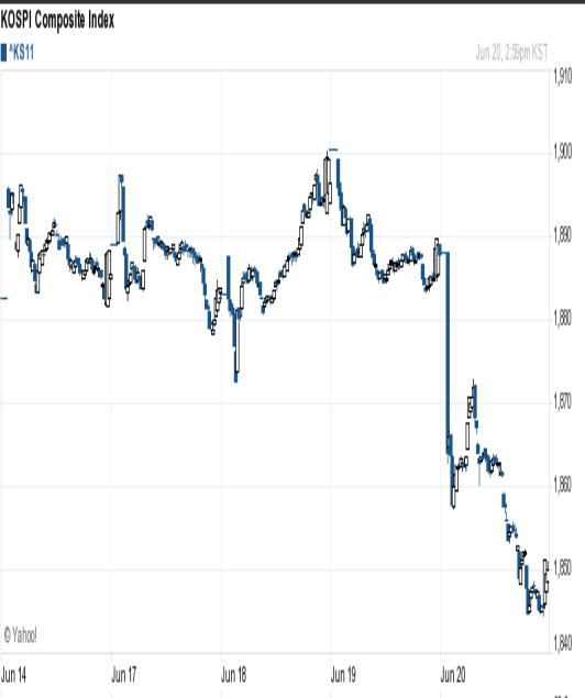 【経済】韓国金融市場がパニックに ウォン・株式・債券急落【ソウル聯合ニュース】 米国が大幅な金融緩和を元に戻す「出口戦略」に言及したことから、 韓国金融市場でウォン相場、株式、債券がそろって急落した。 20日のソウル外国為替市場で、ウォン・ドル相場は前日比14.9ウォン安の1ドル=1145.7ウォンで取引を終えた。 午後1時すぎには一時1ドル=1146.6ウォンをつけ、年初来最安値を更新した。 終値基準では、昨年7月26日(1ドル=1146.9ウォン)以来、約11カ月ぶりの安値。 米連邦準備制度理事会(FRB)のバーナンキ議長が、米国債を大規模に買い入れる現在の金融緩和策について 「今年中に縮小することが適切」との考えを示したことから米国債の金利が急騰、ドルが上昇し、ウォンを売ってドルを買う動きが強まった。 また、同日に発表された中国の6月の製造業購買担当者景気指数(PMI)が市場の予想を下回ったことから、韓国経済への悪影響に対する懸念も広がった。 この日の総合株価指数(KOSPI)は前日比37.82ポイント(2.00%)下落し1850.49で引けた。 前日比23.94ポイント(1.27%)下落の1864.37で寄り付き、小幅な値動きを繰り返していたが、中国のPMIが悪化したとの発表を受け、午後に入り下げ幅を広げた。 韓国の債券市場では午後2時現在、3年物国債の金利が前日比0.17%上昇し2.98%を記録。上昇幅は今年最大となった。 5年物の金利は0.17%、10年物も0.18%、それぞれ上昇した。 2013/06/20 17:45 http://japanese.yonhapnews.co.kr/economy/2013/06/20/0500000000AJP20130620003200882.HTML 2: <丶`∀´>(´・ω・`)(`ハ´ )さん :2013/06/20(木) 18:27:39.19 ID: SjHsbEhw