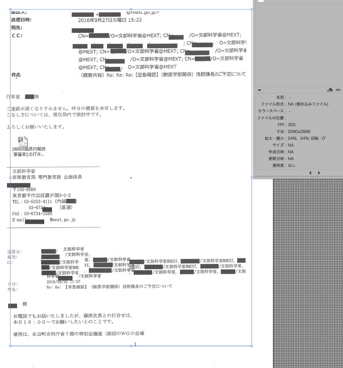 加計学園圧力文書[4]え〜と、Illustrator持ってる皆さん、民進党サイトのpdfをIllustratorで開けてみてください。こんなことになりませんか??なんか複数のデータをつぎはぎして作られてるんですけど。。https://www.minshin.or.jp/article/111935/ 返信先: @KooYeahさん これはスキャンデータをpdfに変換する際にこういう処理されてるだけ?…にしては分割の仕方がおかしいんだけど…何だ?? 返信先: @KooYeahさん 空也さんが空也をリツイートしました 皆さんお騒がせしております。肝心のメール文書そのものに関しても検証してみましたが、こっちは捏造で断定できると思います。 返信先: @KooYeahさん、@YokaiWatcherKeiさん イラストレーター持ってないので複数のデータ切り貼りしたかどうかはわかりませんがスキャナーの表面ゴミだらけなんすかね?もともとの電子データーをPDF化したわけじゃないのがまるわかりですねぇゴミだらけ。しかも違う複数の紙を(解像度が違う取り込みした)のを切り貼りしてますねぇ それですが、ゴミの位置が不定なんですよね。つまりスキャン面のガラスに付いたゴミじゃ無いです。民進党はキヤノンのプリンタとして使えるレーザー複合機でPDF作ってますから、上記よりデータ印刷即スキャンでもない様です。その辺から、たぶん印刷された文書をどこかから入手してますね。 返信先: @KooYeahさん、@YokaiWatcherKeiさん えぇスキャン面じゃないですよコレwテクがない人間がおまかせでカラーで紙原稿を取り込みます。そうですねぇ・・・ワードあたりで画像ファイルとして追加しトリミングで必要なところを除きます。そして同様の形で追加して、一つの文書ように見える形になったらPDFで保存すると・・・、ね? 返信先: @renju5963さん、@KooYeahさん、@YokaiWatcherKeiさん レタッチソフトを取り扱える人間であればゴミをきちんと取り除くのでしょうがねそもこの程度の文章量ならはんこが絡むところ意外は打ち直したほうがまだきれいに見えたでしょうに。フォントデータが埋め込まれることもないからまァ使用ソフトなどはともかく手段の予想として的外れとは思いません 返信先: @renju5963さん、@YokaiWatcherKeiさん ああ、PDF自体の作成プログラムがレーザー複合機なんですよ。詳しい方なら複合機取り込み→PCから画像開いてゴミ取り保存→複合機でPDF作成はできると思いますが、たぶん民進党の方は外部から入手して本物と思い込まれてたんじゃないかと・・・ 返信先: @KooYeahさん、@renju5963さん、@YokaiWatcherKeiさん あと、PDFをIllustratorで開くと人ではできないような画像の分割状態になっていたりしますので、文書として印刷したものを最終段階で複合機を使いスキャンしてからPDFにしたってことで間違いは無いかと思います。文書作成段階では仰るようなことはあった可能性が高いですね。 返信先: @KooYeahさん 初めまして。見てみました。ものすごく変な書類ですね。プリントアウトしたメールをスキャンしたとしても、こんなふうになる理由がありません。複数のオブジェクト(しかもグレースケールと白黒二値の二種類)がモザイクのように入り混じって一枚の画像のように見せかけています。何をしたらこうなる。 返信先: @pisankunさん はじめまして。コメント有り難うございます。推測ですが、どうも一旦画像で取り込んだ後PDF変換する際用途に合わせて画像を自動加工するようです。その時に画質の悪い部分や格子様の画数多い漢字をグレーと誤判定してる印象ですね。最初なんでこうなるのか凄く混乱しました^^;; 返信先: @KooYeahさん お返事ありがとうございます。ああ、PDFに変換する際に、全部文字なのに勝手に「写真部分」と「テキスト部分」に自動判定してつぎはぎに仕上げている、ということですね。わかりました。それにしても無意味に汚い仕上がりなのでギョッとしますね 返信先: @pisankunさん ですね^^;;最初汚い部分は切り貼りなどのアナログで書き換えられたところなのかと疑いましたし、実際汚れなのか書き換え痕なのか判断に苦しむ部分もありますので、本当にビックリしますね^m^;; 返信先: @kimuhiさん、@Ally_nonameさん 誤解を与えてしまったようでしたらごめんなさい。このエントリは初期に混乱してあげてしまった物でして、このPDFの構造そのものは問題ないとの結論に至っております。それよりも添付ファイルのアイコンに捏造疑惑があったり、メールのヘッダがおかしいなどの方が大問題かと思いますよ。 返信先: @kimuhiさん、@Ally_nonameさん ファイルアイコンは、対応するアイコンが無い場合は白い紙のアイコンになりますが、ファイル名は生きてますから、表示がおかしいことを何一つ説明できないんですよ。「アイコンが普通に表示される=そのアイコンがPC内に登録されている。」です。
