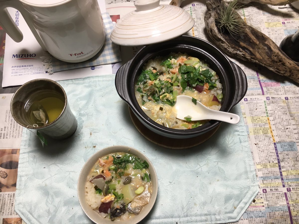 昼に食べた湯豆腐の残り汁、刻んだ昆布、ネギ、ミョウガを使って。
