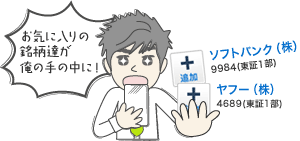 ポートフォリオがパソコンと同期! パソコン版と同期するポートフォリオは、スマートフォンからも追加や編集ができます。 ![]() ※実際に銘柄を入手するものではありません。
