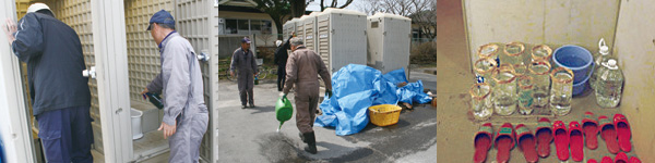 トイレでの活用法http://www.em-seikatsu.co.jp/doc/toilet.jpg災害時に最も問題視されるのがトイレ。避難所では多くの方が共同で使用し、水道が使えない場合や密集して仮設トイレが設置される場合が多いので、悪臭が漂いがち。直接、土に排せつ物を入れる場合はEMにより分解が促進される効果があり、そうでない場合は悪臭抑制として効果的です。 EM活用方法 ■EM活性液を50〜100倍に希釈し、ニオイの元やトイレ全体に散布。(1日数回) ■水がないところでは、直接EMボカシをふりかける。 ■置き水にEM活性液を200〜300倍希釈液となるように入れておき、流す。 期待できる効果 ☆悪臭の抑制・再発防止 http://www.em-seikatsu.co.jp/doc/toilet8.jpg トイレ内にEM活性液を散布 トイレの周辺にもEM活性液を散布 置き水にもEM活性液を入れておく http://www.em-seikatsu.co.jp/doc/hand.jpgEM活用方法 ■手洗いの代わりに EM活性液の100〜200倍希釈液を手にスプレーしてすりこむ。石けんを使った後にもおススメ。 お風呂代わりの活用法http://www.em-seikatsu.co.jp/doc/bath.jpg災害時は飲料水の確保が先決であり、なかなかお風呂には入れない状態になります。そんな時は「EM無浴法」がおススメ。希釈したEMを布に染み込ませ全身を拭きます。臭いを抑制する効果があり、体表面にいる常在菌のバランスを整えるので、気持ちよく過ごせます。 http://www.em-seikatsu.co.jp/doc/wipe.jpgEM活用方法 ■100〜200倍に希釈したEM活性液に浸した布で体を拭く。(3〜7日に1回) ■同様の希釈液を頭に直接スプレーして乾いたタオルで頭皮をマッサージするか、希釈液を湿らせたタオルで頭皮をマッサージする。 期待できる効果 ☆臭気の抑制 洗濯への活用法http://www.em-seikatsu.co.jp/doc/randly.jpg洗濯機で行う場合、水は一度しか使用できませんし、洗剤を使った場合は再利用もままなりません。EMを希釈した水に、汚れた服を一晩漬け置きすることで、汚れ落ちが良くなります。 後は簡単にすすいで干すだけです。 http://www.em-seikatsu.co.jp/doc/towel.jpgEM活用方法 ■EM活性液を500〜1000 倍程度に希釈した水に、汚れた服を一晩漬け置きし、簡単にすすいで干す。 期待できる効果 ☆汚れ落ちがよくなる ☆上澄水は再度洗濯に利用することができる EM活用方法 ■EM活性液を500〜1000倍程度に希釈した水を1日数回服に散布。 期待できる効果 ☆ホコリや体臭の軽減 ☆汚れ防止 飲料水以外の水処理http://www.em-seikatsu.co.jp/doc/water.jpg災害時は上水などが利用できない場合があります。