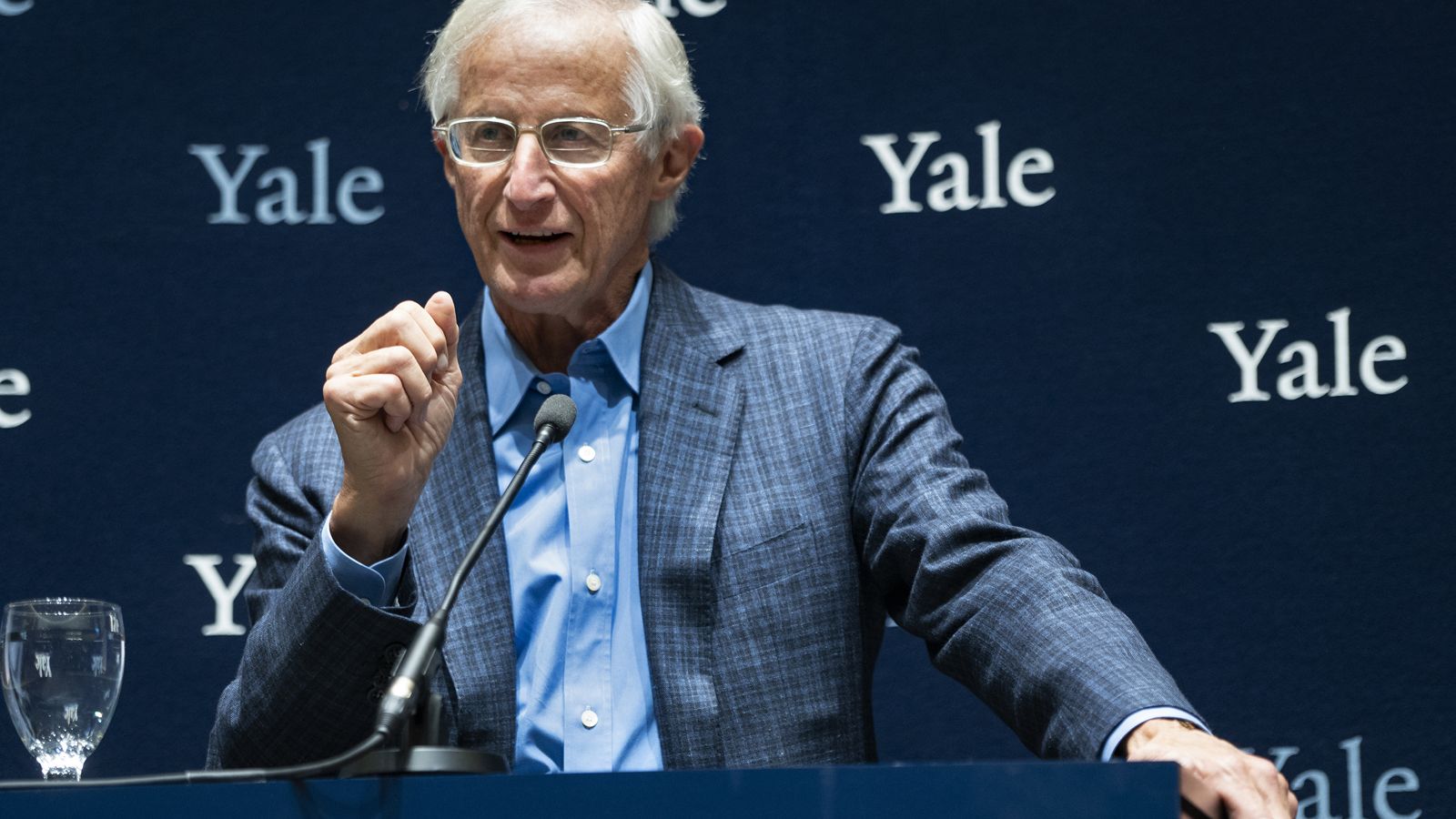 ノーベル経済学賞の受賞が決まり会見するノードハウス教授(写真:AP/アフロ)